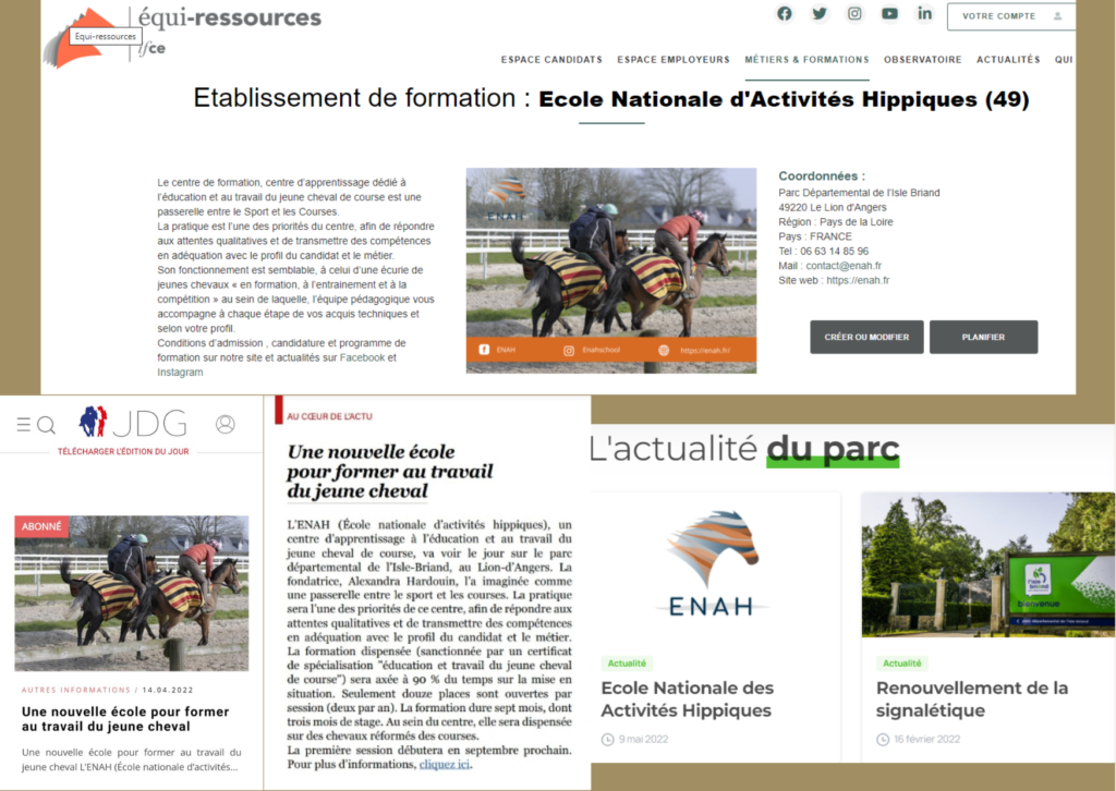 Equi-ressources établissement Ecole Nationale d’Activités Hippiques (49) (equiressources.fr)   Ecole Nationale des Activités Hippiques – Parc départemental de l’Isle Briand (isle-briand.fr)
